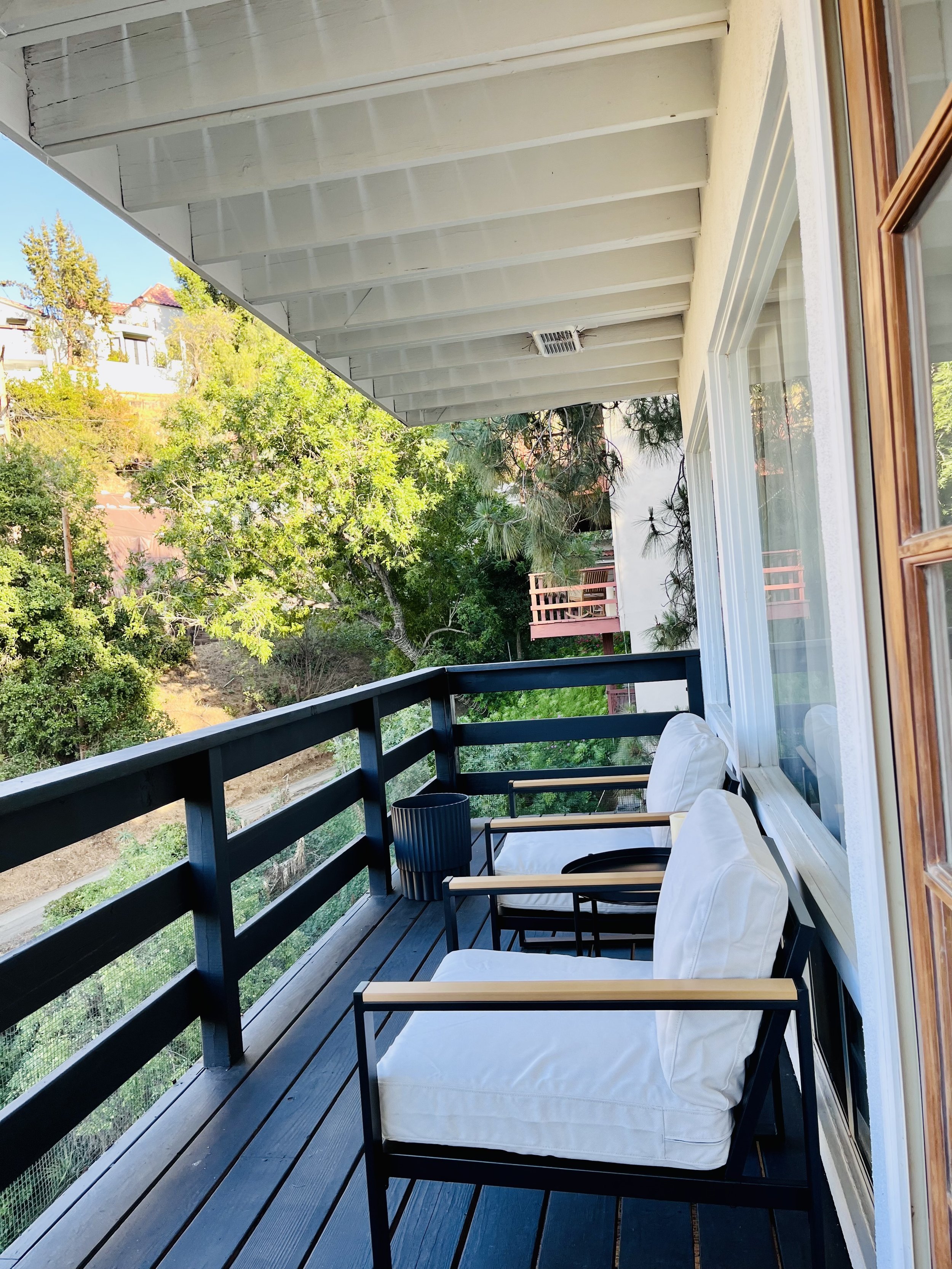 The two private balconies open to fresh air and an abundance of canyon views - a true sanctuary for morning coffee or winding down under the changing light. It’s a quiet reminder that you’re tucked into one of Los Angeles’s most iconic landscapes. The front terrace is filled with sunlight through most of the day and serves as an extended dining and living space. The home includes private driveway parking and keyless entry for easy arrivals and departures, creating a sense of independence and ease throughout your stay.